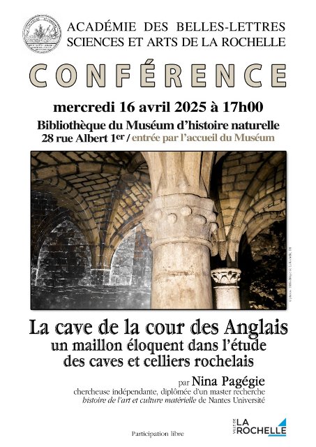 Mercredi 16 avril 2025 : Nina Pagégie chercheuse indépendante diplômée d’un master recherche histoire de l’art et culture matérielle de Nantes université : La cave de la cour des Anglais un maillon éloquent dans l’étude des caves et celliers rochelais