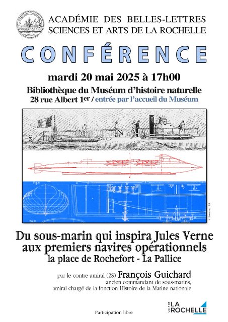 Mardi 20 mai : François Guichard, contre-amiral (2S), ancien commandant de sous-marins et aujourd’hui Amiral chargé de la fonction histoire de la Marine, présentera : Du sous marin qui inspira Jules Verne aux premiers navires opérationnels, la place de Rochefort-La Pallice.