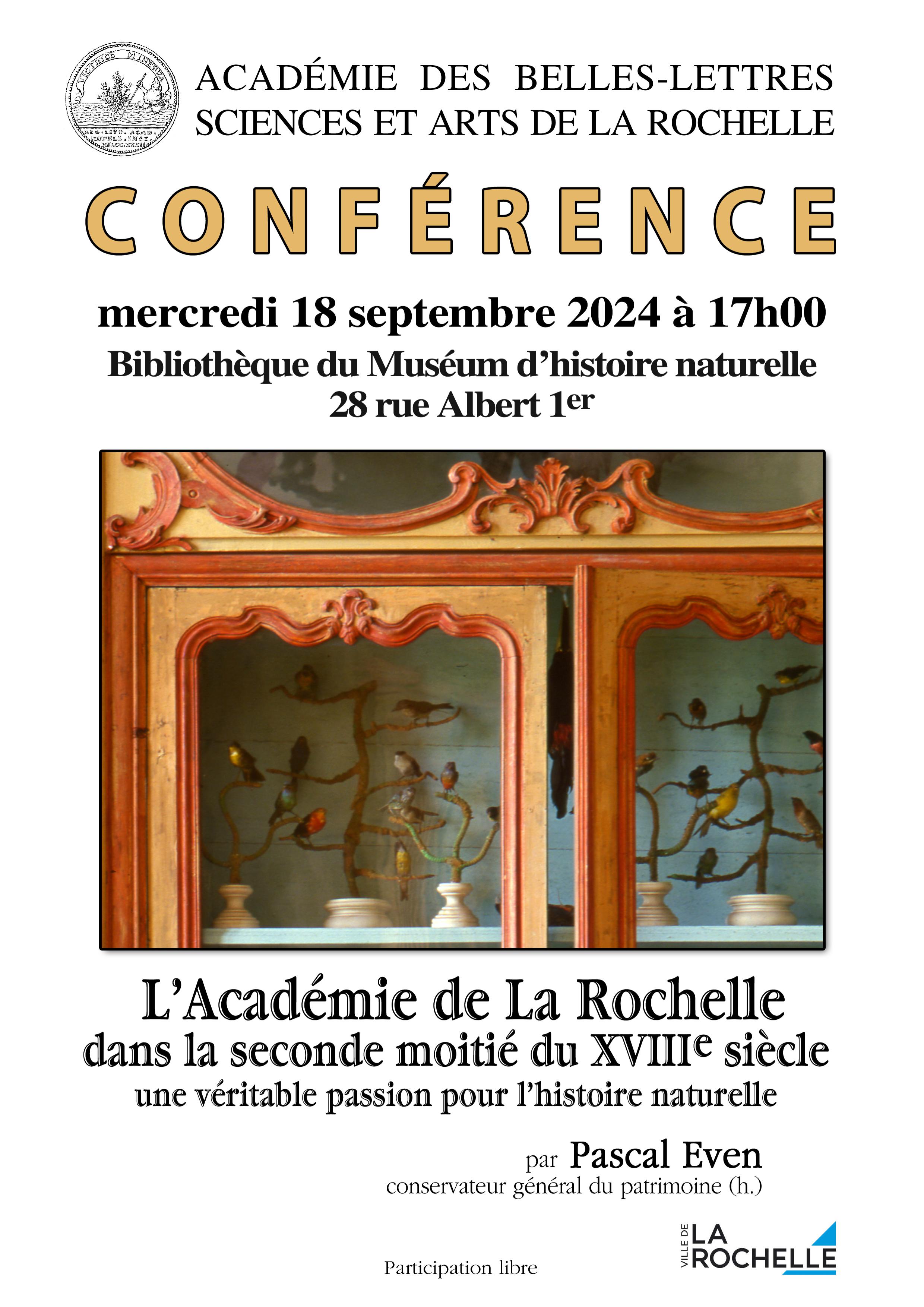 Mercredi 18 septembre 2024 : Pascal EVEN, conservateur général du patrimoine (h.), L’Académie de La Rochelle dans la seconde moitié du XVIIIe siècle : une véritable passion pour l’histoire naturelle.
